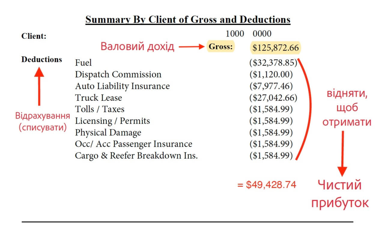Gross: (Валовий дохід) Сума, зароблена до вилучення будь-яких відрахувань.Deductions: Відрахування (Списуються) Витрати, які вже вилучено, потрібно відняти від валових, щоб отримати чисту суму.Будь ласка, переконайтеся, що ваш податковий спеціаліст включив ці відрахування у вашу податкову декларацію.